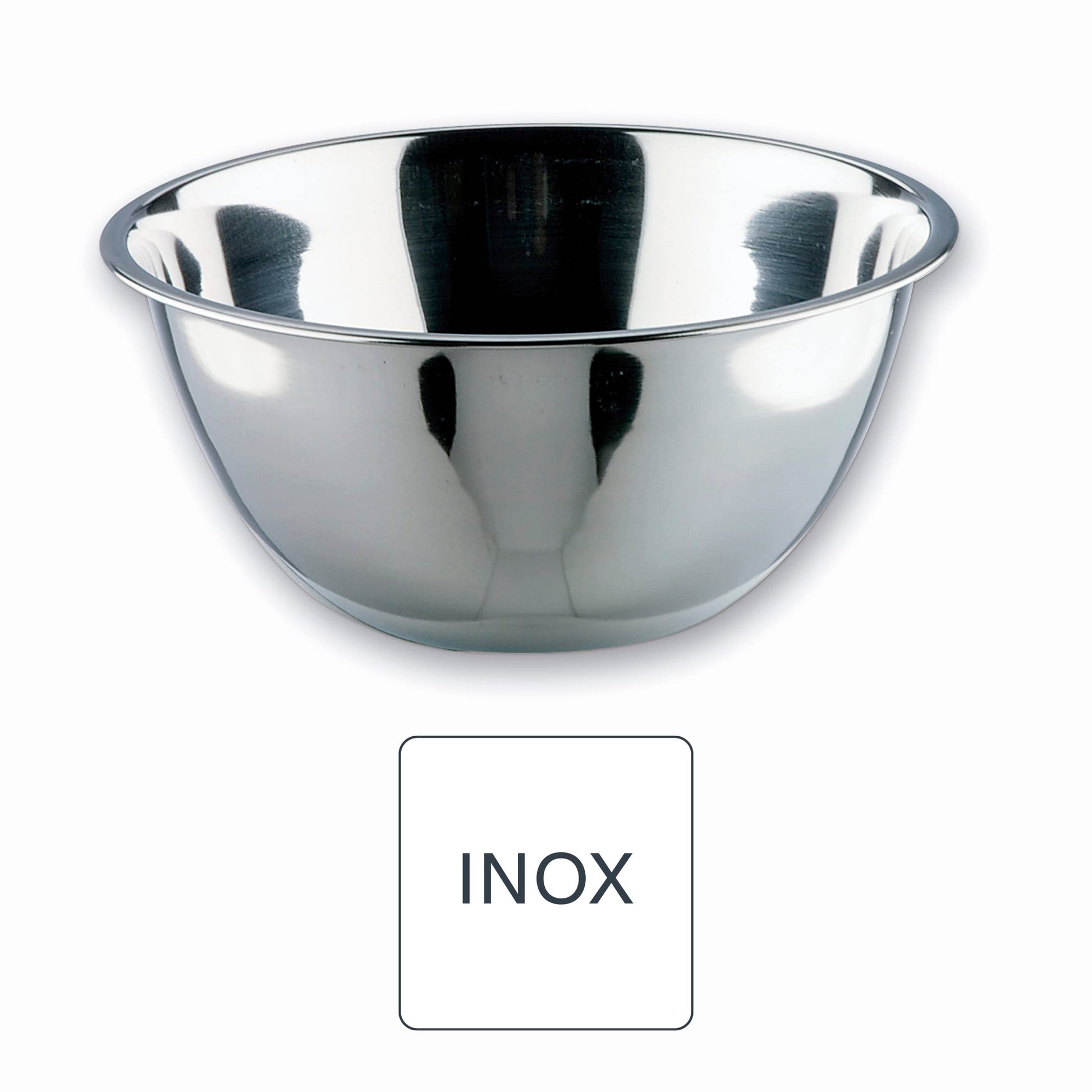 Bol conique en acier inoxydable de haute qualité avec finition brillante. Idéal pour la préparation alimentaire : ne transmet ni odeurs ni saveurs, parfait pour mélanger, fouetter et émulsionner avec précision.