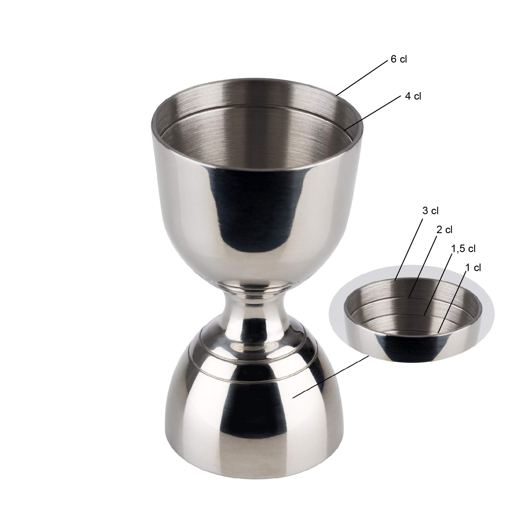 Grâce à ce jigger double dose, réalisez vos cocktails avec une précision millimétrée. Le côté large mesure 6 cl, le petit 3 cl, et les repères internes vous offrent des niveaux intermédiaires pratiques : 1 cl, 1,5 cl, 2 cl et 4 cl. Une régularité parfaite pour des boissons toujours réussies.